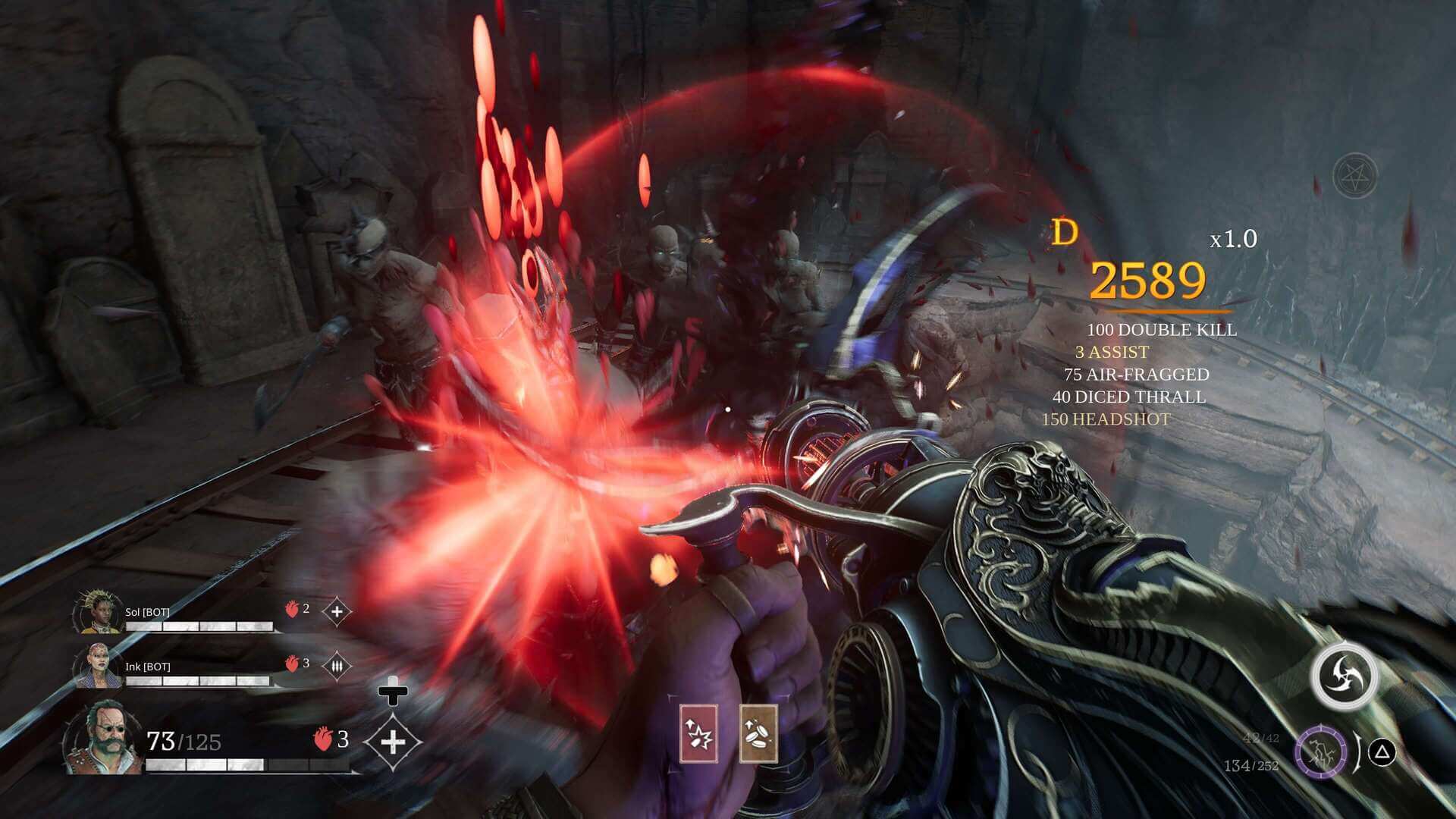 Os objetivos são exatamente o que você espera de um jogo multiplayer. Tem inimigos infinitos até você chegar nas arenas com objetivos, então o esquema é sair correndo, ao invés de perder tempo matando geral. Quando a porta se fecha, você precisa fazer algo. Pelo que joguei, este objetivo é sempre matar algumas ondas de inimigos ou transportar tanques de sangue.