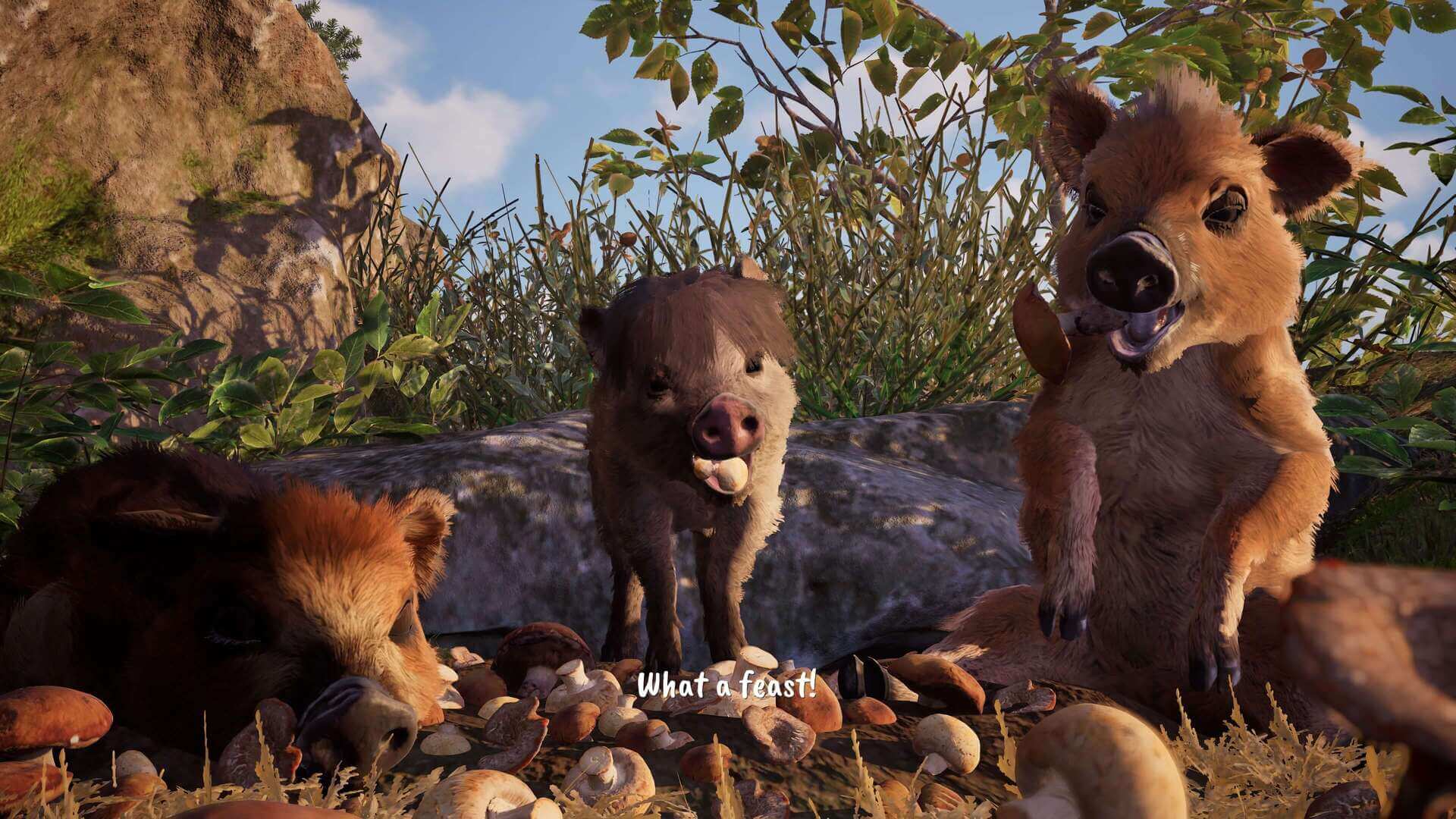 O gameplay envolve plataforma básica e exploração de um pequeno mundo aberto. Não há um mapa propriamente dito, então você é guiado pelo seu nariz. Só que você é um javali. E, como um bichinho de verdade, se você está seguindo o cheiro de algo importante, como um irmão, e um cheiro mais forte aparece, você se distrai. Assim, cheirar é o principal foco do jogo. Cada novo cheiro aparece no seu menu e, ao encontrá-lo, você tem dois objetivos. Cheirar X daquele troço permite ignorar o cheiro. Ou então você pode cheirar Y dele para ganhar uma roupinha fofa. Ah, sim: Y>X, ok?